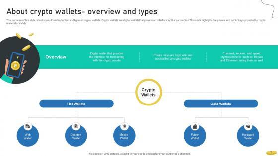 The purpose of this slide is to discuss the introduction and types of crypto wallets. Crypto wallets are digital wallets that provide an interface for the transaction This slide highlights the private and public keys provided by crypto wallets for safety.Find a pre-designed and impeccable About Crypto Wallets Overview And Types Cryptocurrency Management With Blockchain. The templates can ace your presentation without additional effort. You can download these easy-to-edit presentation templates to make your presentation stand out from others. So, what are you waiting for Download the template from Slidegeeks today and give a unique touch to your presentation. The purpose of this slide is to discuss the introduction and types of crypto wallets. Crypto wallets are digital wallets that provide an interface for the transaction This slide highlights the private and public keys provided by crypto wallets for safety.