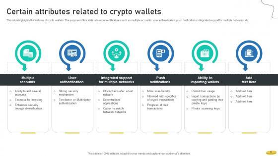 This slide highlights the features of crypto wallets. The purpose of this slide is to represent features such as multiple accounts, user authentication, push notifications, integrated support for multiple networks, etc.Whether you have daily or monthly meetings, a brilliant presentation is necessary. Certain Attributes Related To Crypto Wallets Cryptocurrency Management With Blockchain can be your best option for delivering a presentation. Represent everything in detail using Certain Attributes Related To Crypto Wallets Cryptocurrency Management With Blockchain and make yourself stand out in meetings. The template is versatile and follows a structure that will cater to your requirements. All the templates prepared by Slidegeeks are easy to download and edit. Our research experts have taken care of the corporate themes as well. So, give it a try and see the results. This slide highlights the features of crypto wallets. The purpose of this slide is to represent features such as multiple accounts, user authentication, push notifications, integrated support for multiple networks, etc.