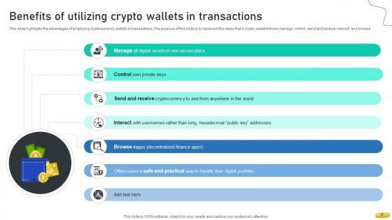 This slide highlights the advantages of employing cryptocurrency wallets in transactions. The purpose of this slide is to represent the steps that a crypto wallet follows manage, control, send and receive, interact, and browse.Slidegeeks is here to make your presentations a breeze with Benefits Of Utilizing Crypto Wallets In Transactions Cryptocurrency Management With Blockchain With our easy-to-use and customizable templates, you can focus on delivering your ideas rather than worrying about formatting. With a variety of designs to choose from, you are sure to find one that suits your needs. And with animations and unique photos, illustrations, and fonts, you can make your presentation pop. So whether you are giving a sales pitch or presenting to the board, make sure to check out Slidegeeks first This slide highlights the advantages of employing cryptocurrency wallets in transactions. The purpose of this slide is to represent the steps that a crypto wallet follows manage, control, send and receive, interact, and browse.