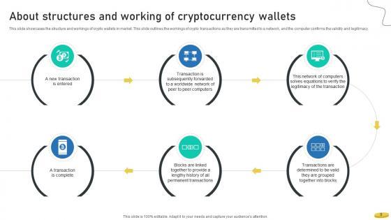 This slide showcases the structure and workings of crypto wallets in market. This slide outlines the workings of crypto transactions as they are transmitted to a network, and the computer confirms the validity and legitimacy.Want to ace your presentation in front of a live audience Our About Structures And Working Of Cryptocurrency Wallets Cryptocurrency Management With Blockchain can help you do that by engaging all the users towards you. Slidegeeks experts have put their efforts and expertise into creating these impeccable powerpoint presentations so that you can communicate your ideas clearly. Moreover, all the templates are customizable, and easy-to-edit and downloadable. Use these for both personal and commercial use. This slide showcases the structure and workings of crypto wallets in market. This slide outlines the workings of crypto transactions as they are transmitted to a network, and the computer confirms the validity and legitimacy.