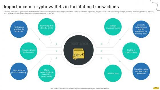 This slide outlines the significance of crypto wallets in transactions of cryptocurrency. The purpose of this slide is to outline the importance of crypto wallets such as no storage of crypto, holdings are stored, private key required, proof of ownership is required, vital role in purchasing the crypto assets, etc.Do you know about Slidesgeeks Importance Of Crypto Wallets In Facilitating Transactions Cryptocurrency Management With Blockchain These are perfect for delivering any kind od presentation. Using it, create PowerPoint presentations that communicate your ideas and engage audiences. Save time and effort by using our pre-designed presentation templates that are perfect for a wide range of topic. Our vast selection of designs covers a range of styles, from creative to business, and are all highly customizable and easy to edit. Download as a PowerPoint template or use them as Google Slides themes. This slide outlines the significance of crypto wallets in transactions of cryptocurrency. The purpose of this slide is to outline the importance of crypto wallets such as no storage of crypto, holdings are stored, private key required, proof of ownership is required, vital role in purchasing the crypto assets, etc.