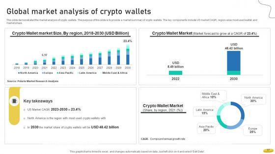 This slide demonstrated the market analysis of crypto wallets. The purpose of this slide is to provide a market summary of crypto wallets. The key components include US market CAGR, region-wise most used wallet, and market share.Retrieve professionally designed Global Market Analysis Of Crypto Wallets Cryptocurrency Management With Blockchain to effectively convey your message and captivate your listeners. Save time by selecting pre-made slideshows that are appropriate for various topics, from business to educational purposes. These themes come in many different styles, from creative to corporate, and all of them are easily adjustable and can be edited quickly. Access them as PowerPoint templates or as Google Slides themes. You do not have to go on a hunt for the perfect presentation because Slidegeeks got you covered from everywhere. This slide demonstrated the market analysis of crypto wallets. The purpose of this slide is to provide a market summary of crypto wallets. The key components include US market CAGR, region-wise most used wallet, and market share.