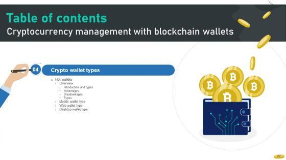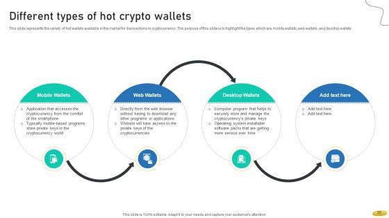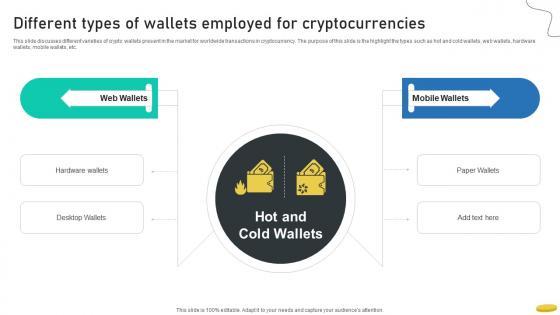 This slide discusses different varieties of crypto wallets present in the market for worldwide transactions in cryptocurrency. The purpose of this slide is the highlight the types such as hot and cold wallets, web wallets, hardware wallets, mobile wallets, etc.Welcome to our selection of the Different Types Of Wallets Employed For Cryptocurrencies Cryptocurrency Management With Blockchain. These are designed to help you showcase your creativity and bring your sphere to life. Planning and Innovation are essential for any business that is just starting out. This collection contains the designs that you need for your everyday presentations. All of our PowerPoints are 100 percent editable, so you can customize them to suit your needs. This multi-purpose template can be used in various situations. Grab these presentation templates today. This slide discusses different varieties of crypto wallets present in the market for worldwide transactions in cryptocurrency. The purpose of this slide is the highlight the types such as hot and cold wallets, web wallets, hardware wallets, mobile wallets, etc.