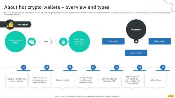 This slide discusses the key takeaways to keep in mind regarding Hot Wallets. This slide outlines that hot wallets which are connected to the internet and very easy to access are beginner-friendly and enable the storing, receiving, and sending of tokens.Create an editable About Hot Crypto Wallets Overview And Types Cryptocurrency Management With Blockchain that communicates your idea and engages your audience. Whether you are presenting a business or an educational presentation, pre-designed presentation templates help save time. About Hot Crypto Wallets Overview And Types Cryptocurrency Management With Blockchain is highly customizable and very easy to edit, covering many different styles from creative to business presentations. Slidegeeks has creative team members who have crafted amazing templates. So, go and get them without any delay. This slide discusses the key takeaways to keep in mind regarding Hot Wallets. This slide outlines that hot wallets which are connected to the internet and very easy to access are beginner-friendly and enable the storing, receiving, and sending of tokens.