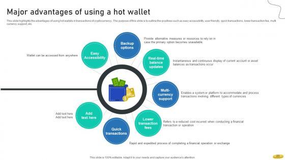 This slide highlights the advantages of using hot wallets in transactions of cryptocurrency. The purpose of this slide is to outline the positives such as easy accessibility, user friendly, quick transactions, lower transaction fee, multi currency support, etc.Want to ace your presentation in front of a live audience Our Major Advantages Of Using A Hot Wallet Cryptocurrency Management With Blockchain can help you do that by engaging all the users towards you. Slidegeeks experts have put their efforts and expertise into creating these impeccable powerpoint presentations so that you can communicate your ideas clearly. Moreover, all the templates are customizable, and easy-to-edit and downloadable. Use these for both personal and commercial use. This slide highlights the advantages of using hot wallets in transactions of cryptocurrency. The purpose of this slide is to outline the positives such as easy accessibility, user friendly, quick transactions, lower transaction fee, multi currency support, etc.