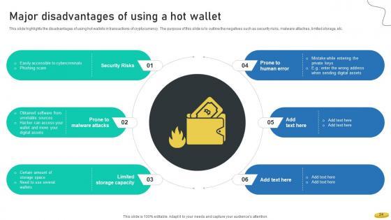 This slide highlights the disadvantages of using hot wallets in transactions of cryptocurrency. The purpose of this slide is to outline the negatives such as security risks, malware attaches, limited storage, etc.There are so many reasons you need a Major Disadvantages Of Using A Hot Wallet Cryptocurrency Management With Blockchain. The first reason is you can not spend time making everything from scratch, Thus, Slidegeeks has made presentation templates for you too. You can easily download these templates from our website easily. This slide highlights the disadvantages of using hot wallets in transactions of cryptocurrency. The purpose of this slide is to outline the negatives such as security risks, malware attaches, limited storage, etc.