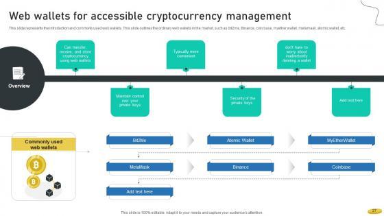 This slide represents the introduction and commonly used web wallets. This slide outlines the ordinary web wallets in the market, such as bit2me, Binance, coin base, myether wallet, metamask, atomic wallet, etc.Explore a selection of the finest Web Wallets For Accessible Cryptocurrency Management Cryptocurrency Management With Blockchain here. With a plethora of professionally designed and pre-made slide templates, you can quickly and easily find the right one for your upcoming presentation. You can use our Web Wallets For Accessible Cryptocurrency Management Cryptocurrency Management With Blockchain to effectively convey your message to a wider audience. Slidegeeks has done a lot of research before preparing these presentation templates. The content can be personalized and the slides are highly editable. Grab templates today from Slidegeeks. This slide represents the introduction and commonly used web wallets. This slide outlines the ordinary web wallets in the market, such as bit2me, Binance, coin base, myether wallet, metamask, atomic wallet, etc.