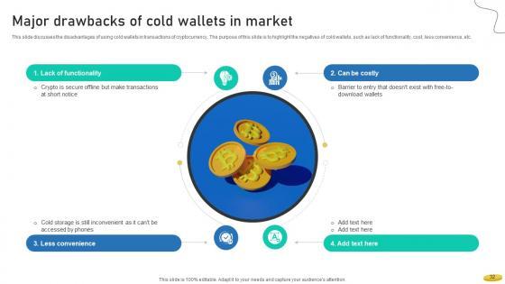 This slide discusses the disadvantages of using cold wallets in transactions of cryptocurrency. The purpose of this slide is to highlight the negatives of cold wallets, such as lack of functionality, cost, less convenience, etc.Do you have to make sure that everyone on your team knows about any specific topic I yes, then you should give Major Drawbacks Of Cold Wallets In Market Cryptocurrency Management With Blockchain a try. Our experts have put a lot of knowledge and effort into creating this impeccable Major Drawbacks Of Cold Wallets In Market Cryptocurrency Management With Blockchain. You can use this template for your upcoming presentations, as the slides are perfect to represent even the tiniest detail. You can download these templates from the Slidegeeks website and these are easy to edit. So grab these today This slide discusses the disadvantages of using cold wallets in transactions of cryptocurrency. The purpose of this slide is to highlight the negatives of cold wallets, such as lack of functionality, cost, less convenience, etc.