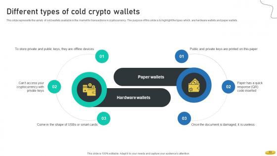 This slide represents the variety of cold wallets available in the market for transactions in cryptocurrency. The purpose of this slide is to highlight the types which, are hardware wallets and paper wallets.This modern and well-arranged Different Types Of Cold Crypto Wallets Cryptocurrency Management With Blockchain provides lots of creative possibilities. It is very simple to customize and edit with the Powerpoint Software. Just drag and drop your pictures into the shapes. All facets of this template can be edited with Powerpoint, no extra software is necessary. Add your own material, put your images in the places assigned for them, adjust the colors, and then you can show your slides to the world, with an animated slide included. This slide represents the variety of cold wallets available in the market for transactions in cryptocurrency. The purpose of this slide is to highlight the types which, are hardware wallets and paper wallets.
