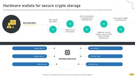 This slide represents overview and hardware devices of hardware crypto wallet. The purpose of this slide is to highlight some device used such as ledger nano x, trezor model t, ledge nano s, etc.Presenting this PowerPoint presentation, titled Hardware Wallets For Secure Crypto Storage Cryptocurrency Management With Blockchain, with topics curated by our researchers after extensive research. This editable presentation is available for immediate download and provides attractive features when used. Download now and captivate your audience. Presenting this Hardware Wallets For Secure Crypto Storage Cryptocurrency Management With Blockchain. Our researchers have carefully researched and created these slides with all aspects taken into consideration. This is a completely customizable Hardware Wallets For Secure Crypto Storage Cryptocurrency Management With Blockchain that is available for immediate downloading. Download now and make an impact on your audience. Highlight the attractive features available with our PPTs. This slide represents overview and hardware devices of hardware crypto wallet. The purpose of this slide is to highlight some device used such as ledger nano x, trezor model t, ledge nano s, etc.