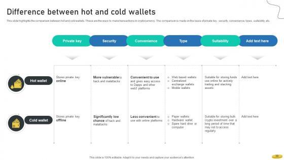 This slide highlights the comparison between hot and cold wallets. These are the ways to make transactions in cryptocurrency. The comparison is made on the basis of private key, security, convenience, types, suitability, etc. Coming up with a presentation necessitates that the majority of the effort goes into the content and the message you intend to convey. The visuals of a PowerPoint presentation can only be effective if it supplements and supports the story that is being told. Keeping this in mind our experts created Difference Between Hot And Cold Wallets Cryptocurrency Management With Blockchain to reduce the time that goes into designing the presentation. This way, you can concentrate on the message while our designers take care of providing you with the right template for the situation. This slide highlights the comparison between hot and cold wallets. These are the ways to make transactions in cryptocurrency. The comparison is made on the basis of private key, security, convenience, types, suitability, etc.