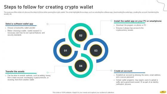 The purpose of this slide is to discuss the steps to follow while opening the crypto wallet. This slide highlights those steps, such as selecting the software app, downloading the wallet app, creating the account, transferring the assets, etc.If your project calls for a presentation, then Slidegeeks is your go-to partner because we have professionally designed, easy-to-edit templates that are perfect for any presentation. After downloading, you can easily edit Steps To Follow For Creating Crypto Wallet Cryptocurrency Management With Blockchain and make the changes accordingly. You can rearrange slides or fill them with different images. Check out all the handy templates The purpose of this slide is to discuss the steps to follow while opening the crypto wallet. This slide highlights those steps, such as selecting the software app, downloading the wallet app, creating the account, transferring the assets, etc.