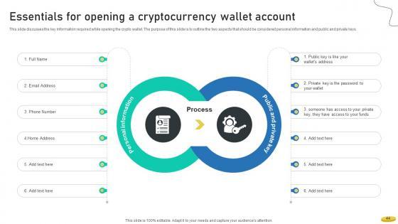 This slide discusses the key information required while opening the crypto wallet. The purpose of this slide is to outline the two aspects that should be considered personal information and public and private keys.Explore a selection of the finest Essentials For Opening A Cryptocurrency Wallet Account Cryptocurrency Management With Blockchain here. With a plethora of professionally designed and pre-made slide templates, you can quickly and easily find the right one for your upcoming presentation. You can use our Essentials For Opening A Cryptocurrency Wallet Account Cryptocurrency Management With Blockchain to effectively convey your message to a wider audience. Slidegeeks has done a lot of research before preparing these presentation templates. The content can be personalized and the slides are highly editable. Grab templates today from Slidegeeks. This slide discusses the key information required while opening the crypto wallet. The purpose of this slide is to outline the two aspects that should be considered personal information and public and private keys.