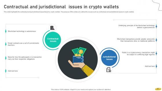 This slide highlights the contractual and jurisdictional issues faced by crypto wallets. The purpose of this slide is to outline the issues such as contractual and jurisdictional issues in crypto wallets.Are you in need of a template that can accommodate all of your creative concepts This one is crafted professionally and can be altered to fit any style. Use it with Google Slides or PowerPoint. Include striking photographs, symbols, depictions, and other visuals. Fill, move around, or remove text boxes as desired. Test out color palettes and font mixtures. Edit and save your work, or work with colleagues. Download Contractual And Jurisdictional Issues In Crypto Wallets Cryptocurrency Management With Blockchain and observe how to make your presentation outstanding. Give an impeccable presentation to your group and make your presentation unforgettable. This slide highlights the contractual and jurisdictional issues faced by crypto wallets. The purpose of this slide is to outline the issues such as contractual and jurisdictional issues in crypto wallets.