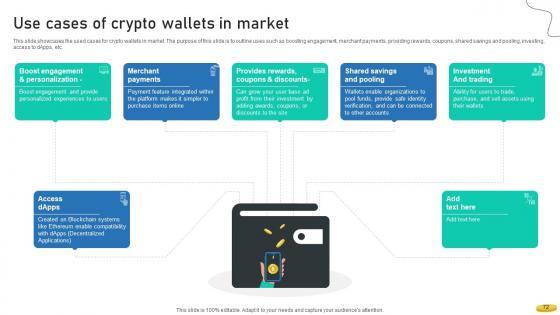 This slide showcases the used cases for crypto wallets in market. The purpose of this slide is to outline uses such as boosting engagement, merchant payments, providing rewards, coupons, shared savings and pooling, investing, access to dApps, etc.Formulating a presentation can take up a lot of effort and time, so the content and message should always be the primary focus. The visuals of the PowerPoint can enhance the presenters message, so our Use Cases Of Crypto Wallets In Market Cryptocurrency Management With Blockchain was created to help save time. Instead of worrying about the design, the presenter can concentrate on the message while our designers work on creating the ideal templates for whatever situation is needed. Slidegeeks has experts for everything from amazing designs to valuable content, we have put everything into Use Cases Of Crypto Wallets In Market Cryptocurrency Management With Blockchain. This slide showcases the used cases for crypto wallets in market. The purpose of this slide is to outline uses such as boosting engagement, merchant payments, providing rewards, coupons, shared savings and pooling, investing, access to dApps, etc.
