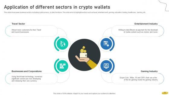 This slide showcases business sectors, including cryptocurrency, in daily functions. This slide aims to highlight sectors such as travel, entertainment, gaming, education, trading, healthcare, banking, etc.Get a simple yet stunning designed Application Of Different Sectors In Crypto Wallets Cryptocurrency Management With Blockchain. It is the best one to establish the tone in your meetings. It is an excellent way to make your presentations highly effective. So, download this PPT today from Slidegeeks and see the positive impacts. Our easy-to-edit Application Of Different Sectors In Crypto Wallets Cryptocurrency Management With Blockchain can be your go-to option for all upcoming conferences and meetings. So, what are you waiting for Grab this template today. This slide showcases business sectors, including cryptocurrency, in daily functions. This slide aims to highlight sectors such as travel, entertainment, gaming, education, trading, healthcare, banking, etc.
