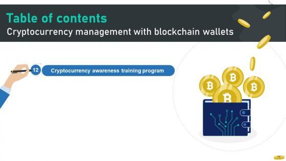 If you are looking for a format to display your unique thoughts, then the professionally designed Table Of Contents For Cryptocurrency Management With Blockchain Wallets is the one for you. You can use it as a Google Slides template or a PowerPoint template. Incorporate impressive visuals, symbols, images, and other charts. Modify or reorganize the text boxes as you desire. Experiment with shade schemes and font pairings. Alter, share or cooperate with other people on your work. Download Table Of Contents For Cryptocurrency Management With Blockchain Wallets and find out how to give a successful presentation. Present a perfect display to your team and make your presentation unforgettable. Our Table Of Contents For Cryptocurrency Management With Blockchain Wallets are topically designed to provide an attractive backdrop to any subject. Use them to look like a presentation pro.