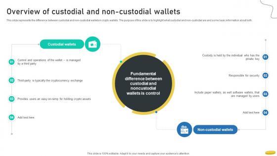 This slide represents the difference between custodial and non-custodial wallets in crypto wallets. The purpose of this slide is to highlight what custodial and non-custodial are and some basic information about both.Present like a pro with Overview Of Custodial And Non Custodial Wallets Cryptocurrency Management With Blockchain. Create beautiful presentations together with your team, using our easy-to-use presentation slides. Share your ideas in real-time and make changes on the fly by downloading our templates. So whether you are in the office, on the go, or in a remote location, you can stay in sync with your team and present your ideas with confidence. With Slidegeeks presentation got a whole lot easier. Grab these presentations today. This slide represents the difference between custodial and non-custodial wallets in crypto wallets. The purpose of this slide is to highlight what custodial and non-custodial are and some basic information about both.