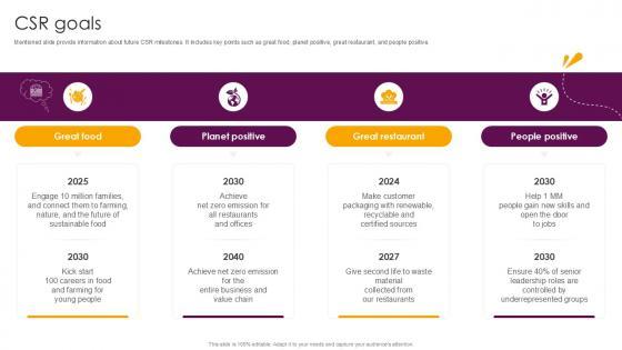 Mentioned slide provide information about future CSR milestones. It includes key points such as great food, planet positive, great restaurant, and people positive. Find highly impressive CSR Goals Food And Beverages Company Profile Ppt Sample CP SS V on Slidegeeks to deliver a meaningful presentation. You can save an ample amount of time using these presentation templates. No need to worry to prepare everything from scratch because Slidegeeks experts have already done a huge research and work for you. You need to download CSR Goals Food And Beverages Company Profile Ppt Sample CP SS V for your upcoming presentation. All the presentation templates are 100 percent editable and you can change the color and personalize the content accordingly. Download now Mentioned slide provide information about future CSR milestones. It includes key points such as great food, planet positive, great restaurant, and people positive.