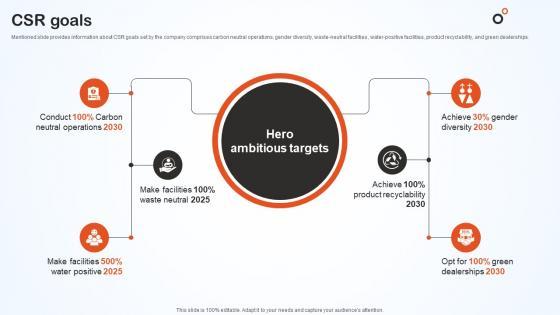 Mentioned slide provides information about CSR goals set by the company comprises carbon neutral operations, gender diversity, waste-neutral facilities , water-positive facilities, product recyclability, and green dealerships. Get a simple yet stunning designed Csr Goals Hero Bike Company Profile CP SS V. It is the best one to establish the tone in your meetings. It is an excellent way to make your presentations highly effective. So, download this PPT today from Slidegeeks and see the positive impacts. Our easy-to-edit Csr Goals Hero Bike Company Profile CP SS V can be your go-to option for all upcoming conferences and meetings. So, what are you waiting for Grab this template today. Mentioned slide provides information about CSR goals set by the company comprises carbon neutral operations, gender diversity, waste-neutral facilities , water-positive facilities, product recyclability, and green dealerships.
