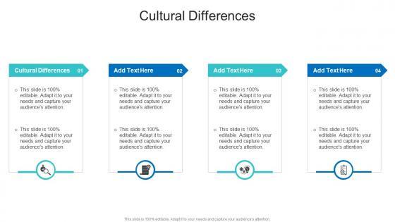 Introducing our well designed Cultural Differences In Powerpoint And Google Slides Cpb. This PowerPoint design presents information on topics like Cultural Differences. As it is predesigned it helps boost your confidence level. It also makes you a better presenter because of its high quality content and graphics. This PPT layout can be downloaded and used in different formats like PDF, PNG, and JPG. Not only this, it is available in both Standard Screen and Widescreen aspect ratios for your convenience. Therefore, click on the download button now to persuade and impress your audience. Our Cultural Differences In Powerpoint And Google Slides Cpb are topically designed to provide an attractive backdrop to any subject. Use them to look like a presentation pro.