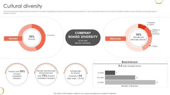 This slide represents cultural diversity overview for Accenture highlighting company board diversity and board tenure. It also covers information such as board committee members, diverse directors and average age for director nominee.Slidegeeks is here to make your presentations a breeze with Cultural Diversity Global Consulting And Technology Services Company Profile CP SS V With our easy-to-use and customizable templates, you can focus on delivering your ideas rather than worrying about formatting. With a variety of designs to choose from, you are sure to find one that suits your needs. And with animations and unique photos, illustrations, and fonts, you can make your presentation pop. So whether you are giving a sales pitch or presenting to the board, make sure to check out Slidegeeks first This slide represents cultural diversity overview for Accenture highlighting company board diversity and board tenure. It also covers information such as board committee members, diverse directors and average age for director nominee.