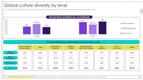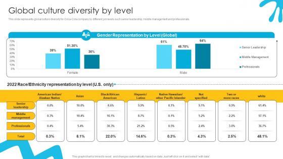 This slide represents global culture diversity for Coca-Cola company by different job levels such senior leadership, middle management and professionals. Find a pre-designed and impeccable Global Culture Diversity By Level Liquid Refreshment Manufacturer Company Profile Ppt Powerpoint CP SS V. The templates can ace your presentation without additional effort. You can download these easy-to-edit presentation templates to make your presentation stand out from others. So, what are you waiting for Download the template from Slidegeeks today and give a unique touch to your presentation. This slide represents global culture diversity for Coca-Cola company by different job levels such senior leadership, middle management and professionals.