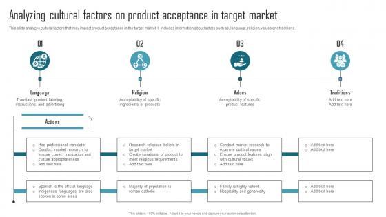 This slide analyzes cultural factors that may impact product acceptance in the target market. It includes information about factors such as,language, religion, values and traditions. Slidegeeks is one of the best resources for PowerPoint templates. You can download easily and regulate Effective Product Adaptation Analyzing Cultural Factors On Product Acceptance In Target Market Introduction PDF for your personal presentations from our wonderful collection. A few clicks is all it takes to discover and get the most relevant and appropriate templates. Use our Templates to add a unique zing and appeal to your presentation and meetings. All the slides are easy to edit and you can use them even for advertisement purposes. This slide analyzes cultural factors that may impact product acceptance in the target market. It includes information about factors such as,language, religion, values and traditions.