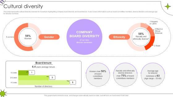 This slide represents cultural diversity overview for Accenture highlighting company board diversity and board tenure. It also covers information such as board committee members, diverse directors and average age for director nominee.Slidegeeks is here to make your presentations a breeze with Cultural Diversity Global Consulting And Technology Services Company Profile CP SS V With our easy-to-use and customizable templates, you can focus on delivering your ideas rather than worrying about formatting. With a variety of designs to choose from, you are sure to find one that suits your needs. And with animations and unique photos, illustrations, and fonts, you can make your presentation pop. So whether you are giving a sales pitch or presenting to the board, make sure to check out Slidegeeks first This slide represents cultural diversity overview for Accenture highlighting company board diversity and board tenure. It also covers information such as board committee members, diverse directors and average age for director nominee.