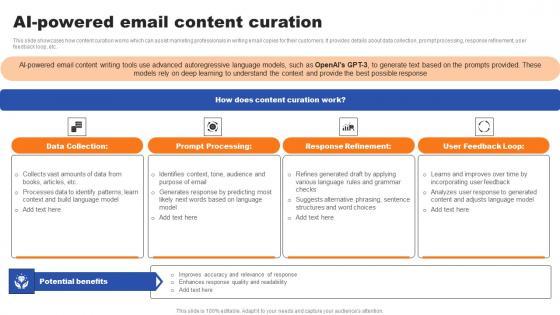 This slide showcases how content curation works which can assist marketing professionals in writing email copies for their customers. It provides details about data collection, prompt processing, response refinement, user feedback loop, etc. There are so many reasons you need a AI Powered Email Content Curation Ppt Infographics Graphics Pictures PDF. The first reason is you can not spend time making everything from scratch, Thus, Slidegeeks has made presentation templates for you too. You can easily download these templates from our website easily.