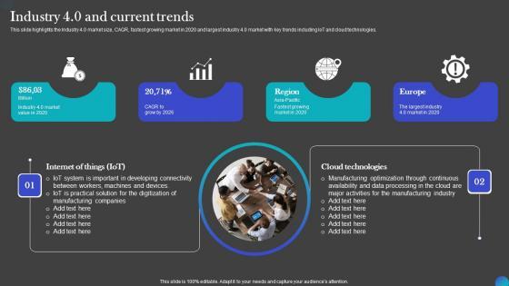 This slide highlights the Industry 4.0 market size, CAGR, fastest growing market in 2020 and largest industry 4.0 market with key trends including IoT and cloud technologies. If your project calls for a presentation, then Slidegeeks is your go-to partner because we have professionally designed, easy-to-edit templates that are perfect for any presentation. After downloading, you can easily edit Industry 40 And Current Trends IOT Adoption Manufacturing Themes PDF and make the changes accordingly. You can rearrange slides or fill them with different images. Check out all the handy templates This slide highlights the Industry 4.0 market size, CAGR, fastest growing market in 2020 and largest industry 4.0 market with key trends including IoT and cloud technologies.