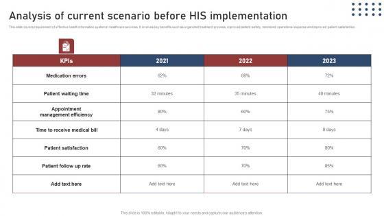 This slide covers requirement of effective health information system in healthcare services. It involves key benefits such as organized treatment process, improved patient safety, minimized operational expense and improved patient satisfaction. Boost your pitch with our creative Analysis Current Scenario Transforming Medical Workflows Via His Integration Rules Pdf. Deliver an awe inspiring pitch that will mesmerize everyone. Using these presentation templates you will surely catch everyones attention. You can browse the ppts collection on our website. We have researchers who are experts at creating the right content for the templates. So you do not have to invest time in any additional work. Just grab the template now and use them. This slide covers requirement of effective health information system in healthcare services. It involves key benefits such as organized treatment process, improved patient safety, minimized operational expense and improved patient satisfaction.