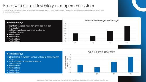 This slide showcases issues faced by organization due to inefficient inventory management process. It shows increase in inventory shrinkage percentage and cost of carrying inventory. Welcome to our selection of the Issues With Current Inventory Administration Techniques For Enhanced Stock Accuracy Mockup Pdf. These are designed to help you showcase your creativity and bring your sphere to life. Planning and Innovation are essential for any business that is just starting out. This collection contains the designs that you need for your everyday presentations. All of our PowerPoints are 100 percent editable, so you can customize them to suit your needs. This multi purpose template can be used in various situations. Grab these presentation templates today This slide showcases issues faced by organization due to inefficient inventory management process. It shows increase in inventory shrinkage percentage and cost of carrying inventory.