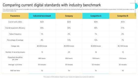 This slide provides glimpse about comparative assessment of production management KPIs with industry standards that help a business to understand current industrial requirements. It includes parameters such as cost of work orders, overall equipment efficiency, etc. Want to ace your presentation in front of a live audience Our Comparing Current Digital Standards With Industry Streamlining Production Operational Slides PDF can help you do that by engaging all the users towards you. Slidegeeks experts have put their efforts and expertise into creating these impeccable powerpoint presentations so that you can communicate your ideas clearly. Moreover, all the templates are customizable, and easy-to-edit and downloadable. Use these for both personal and commercial use. This slide provides glimpse about comparative assessment of production management KPIs with industry standards that help a business to understand current industrial requirements. It includes parameters such as cost of work orders, overall equipment efficiency, etc.