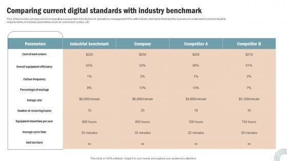 This slide provides glimpse about comparative assessment of production and operations management KPIs with industry standards that help the business to understand current industrial requirements. It includes parameters such as cost of work orders, etc. Slidegeeks is here to make your presentations a breeze with Comparing Current Digital Business Performance Optimization New Operations Strategy Mockup Pdf With our easy to use and customizable templates, you can focus on delivering your ideas rather than worrying about formatting. With a variety of designs to choose from, you are sure to find one that suits your needs. And with animations and unique photos, illustrations, and fonts, you can make your presentation pop. So whether you are giving a sales pitch or presenting to the board, make sure to check out Slidegeeks first This slide provides glimpse about comparative assessment of production and operations management KPIs with industry standards that help the business to understand current industrial requirements. It includes parameters such as cost of work orders, etc.