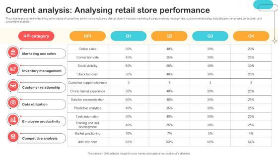 This slide help analyse the declining performance of current key performance indicators of retail store. It includes marketing and sales, inventory management, customer relationship, data utilization, employee productivity, and competitive analysis.Whether you have daily or monthly meetings, a brilliant presentation is necessary. Current Analysis Analysing Retail Store Performance Optimizing Retail Operations With Digital DT SS V can be your best option for delivering a presentation. Represent everything in detail using Current Analysis Analysing Retail Store Performance Optimizing Retail Operations With Digital DT SS V and make yourself stand out in meetings. The template is versatile and follows a structure that will cater to your requirements. All the templates prepared by Slidegeeks are easy to download and edit. Our research experts have taken care of the corporate themes as well. So, give it a try and see the results. This slide help analyse the declining performance of current key performance indicators of retail store. It includes marketing and sales, inventory management, customer relationship, data utilization, employee productivity, and competitive analysis.