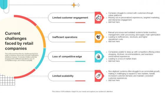 This slide examines the key challenges faced by retail companies due to lack of proper digitization initiatives in place. It includes limited customer engagement, inefficient operations, loss of competitive edge, and limited scalability.Find highly impressive Current Challenges Faced By Retail Companies Optimizing Retail Operations With Digital DT SS V on Slidegeeks to deliver a meaningful presentation. You can save an ample amount of time using these presentation templates. No need to worry to prepare everything from scratch because Slidegeeks experts have already done a huge research and work for you. You need to download Current Challenges Faced By Retail Companies Optimizing Retail Operations With Digital DT SS V for your upcoming presentation. All the presentation templates are 100 percent editable and you can change the color and personalize the content accordingly. Download now This slide examines the key challenges faced by retail companies due to lack of proper digitization initiatives in place. It includes limited customer engagement, inefficient operations, loss of competitive edge, and limited scalability.