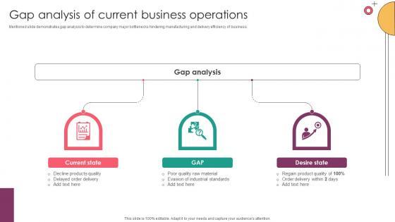 Mentioned slide demonstrates gap analysis to determine company major bottlenecks hindering manufacturing and delivery efficiency of business. If your project calls for a presentation, then Slidegeeks is your go-to partner because we have professionally designed, easy-to-edit templates that are perfect for any presentation. After downloading, you can easily edit Strategic Supplier Evaluation Gap Analysis Of Current Business Operations and make the changes accordingly. You can rearrange slides or fill them with different images. Check out all the handy templates Mentioned slide demonstrates gap analysis to determine company major bottlenecks hindering manufacturing and delivery efficiency of business.