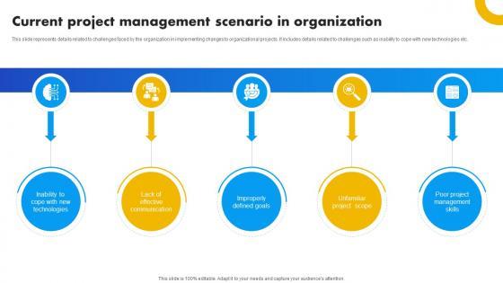 This slide represents details related to challenges faced by the organization in implementing changes to organizational projects. It includes details related to challenges such as inability to cope with new technologies etc. Get a simple yet stunning designed Digital Project Management Strategies Current Project Management Scenario In Organization. It is the best one to establish the tone in your meetings. It is an excellent way to make your presentations highly effective. So, download this PPT today from Slidegeeks and see the positive impacts. Our easy-to-edit Digital Project Management Strategies Current Project Management Scenario In Organization can be your go-to option for all upcoming conferences and meetings. So, what are you waiting for Grab this template today. This slide represents details related to challenges faced by the organization in implementing changes to organizational projects. It includes details related to challenges such as inability to cope with new technologies etc.