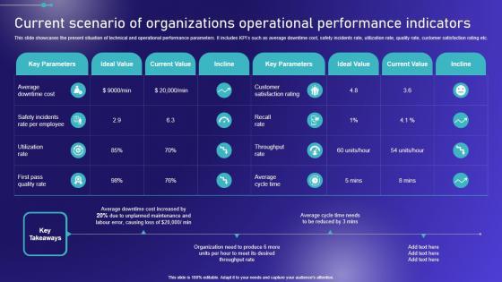 This slide showcases the present situation of technical and operational performance parameters. It includes KPIs such as average downtime cost, safety incidents rate, utilization rate, quality rate, customer satisfaction rating etc. Find highly impressive Current Scenario Of Organizations Operational Embracing Robotic Process Guidelines PDF on Slidegeeks to deliver a meaningful presentation. You can save an ample amount of time using these presentation templates. No need to worry to prepare everything from scratch because Slidegeeks experts have already done a huge research and work for you. You need to download Current Scenario Of Organizations Operational Embracing Robotic Process Guidelines PDF for your upcoming presentation. All the presentation templates are 100 percent editable and you can change the color and personalize the content accordingly. Download now This slide showcases the present situation of technical and operational performance parameters. It includes KPIs such as average downtime cost, safety incidents rate, utilization rate, quality rate, customer satisfaction rating etc.