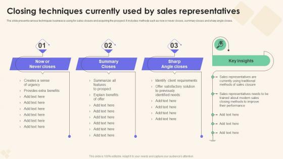 The slide presents various techniques business is using for sales closure and acquiring the prospect. It includes methods such as now or never closes, summary closes and sharp angle closes. Welcome to our selection of the Process Enhancement Plan To Boost Sales Performance Closing Techniques Currently Used By Sales Representatives Template PDF. These are designed to help you showcase your creativity and bring your sphere to life. Planning and Innovation are essential for any business that is just starting out. This collection contains the designs that you need for your everyday presentations. All of our PowerPoints are 100 percent editable, so you can customize them to suit your needs. This multi purpose template can be used in various situations. Grab these presentation templates today.
