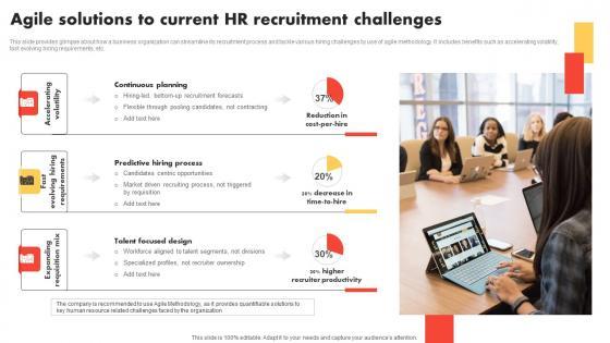 This slide provides glimpse about how a business organization can streamline its recruitment process and tackle various hiring challenges by use of agile methodology. It includes benefits such as accelerating volatility,fast evolving hiring requirements,etc.Find a pre-designed and impeccable Agile Solutions To Current HR Recruitment Enhancing Workforce Productivity Using HR Tips Pdf The templates can ace your presentation without additional effort. You can download these easy-to-edit presentation templates to make your presentation stand out from others. So,what are you waiting for Download the template from Slidegeeks today and give a unique touch to your presentation. This slide provides glimpse about how a business organization can streamline its recruitment process and tackle various hiring challenges by use of agile methodology. It includes benefits such as accelerating volatility, fast evolving hiring requirements, etc.