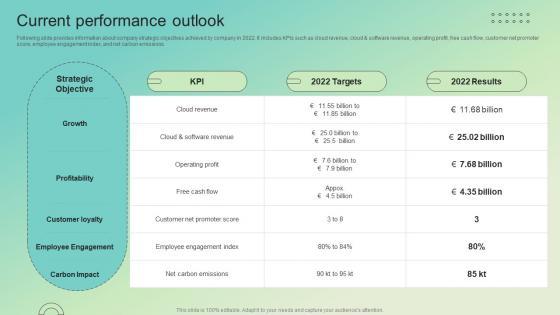 Following slide provides information about company strategic objectives achieved by company in 2022. It includes KPIs such as cloud revenue, cloud and software revenue, operating profit, free cash flow, customer net promoter score, employee engagement index, and net carbon emissions.If you are looking for a format to display your unique thoughts, then the professionally designed Current Performance Outlook Enterprise Software Solution Providing Company Profile CP SS V is the one for you. You can use it as a Google Slides template or a PowerPoint template. Incorporate impressive visuals, symbols, images, and other charts. Modify or reorganize the text boxes as you desire. Experiment with shade schemes and font pairings. Alter, share or cooperate with other people on your work. Download Current Performance Outlook Enterprise Software Solution Providing Company Profile CP SS V and find out how to give a successful presentation. Present a perfect display to your team and make your presentation unforgettable. Following slide provides information about company strategic objectives achieved by company in 2022. It includes KPIs such as cloud revenue, cloud and software revenue, operating profit, free cash flow, customer net promoter score, employee engagement index, and net carbon emissions.