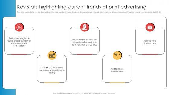 This slide represents the key statistics mentioning the print advertising trends. It includes stats such as rank in the advertising category of hospitals, number of healthcare magazines published in the US, etc. Do you know about Slidesgeeks Key Stats Highlighting Current Trends Of Print Implementation Of Online Ppt Sample These are perfect for delivering any kind od presentation. Using it, create PowerPoint presentations that communicate your ideas and engage audiences. Save time and effort by using our pre-designed presentation templates that are perfect for a wide range of topic. Our vast selection of designs covers a range of styles, from creative to business, and are all highly customizable and easy to edit. Download as a PowerPoint template or use them as Google Slides themes. This slide represents the key statistics mentioning the print advertising trends. It includes stats such as rank in the advertising category of hospitals, number of healthcare magazines published in the US, etc.