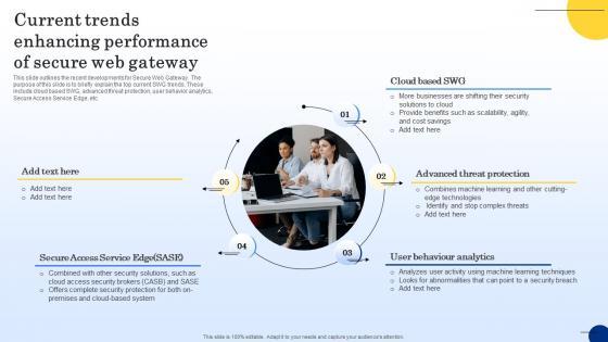 This slide outlines the recent developments for Secure Web Gateway. The purpose of this slide is to briefly explain the top current SWG trends. These include cloud based SWG, advanced threat protection, user behavior analytics, Secure Access Service Edge, etc. Slidegeeks is here to make your presentations a breeze with Current Trends Enhancing Performance Of Secure Web Gateway Web Threat Protection System With our easy-to-use and customizable templates, you can focus on delivering your ideas rather than worrying about formatting. With a variety of designs to choose from, you are sure to find one that suits your needs. And with animations and unique photos, illustrations, and fonts, you can make your presentation pop. So whether you are giving a sales pitch or presenting to the board, make sure to check out Slidegeeks first This slide outlines the recent developments for Secure Web Gateway. The purpose of this slide is to briefly explain the top current SWG trends. These include cloud based SWG, advanced threat protection, user behavior analytics, Secure Access Service Edge, etc.