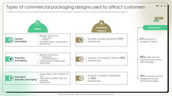 The slide showcases types of commercial food packaging designs used by product development teams in companies. It consists of types such as flexible packaging, protective packaging, etc. Slidegeeks is here to make your presentations a breeze with Comprehensive Guide On Current Strategies Types Of Commercial Packaging Designs Used To Attract Customers With our easy-to-use and customizable templates, you can focus on delivering your ideas rather than worrying about formatting. With a variety of designs to choose from, you are sure to find one that suits your needs. And with animations and unique photos, illustrations, and fonts, you can make your presentation pop. So whether you are giving a sales pitch or presenting to the board, make sure to check out Slidegeeks first The slide showcases types of commercial food packaging designs used by product development teams in companies. It consists of types such as flexible packaging, protective packaging, etc.