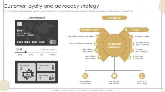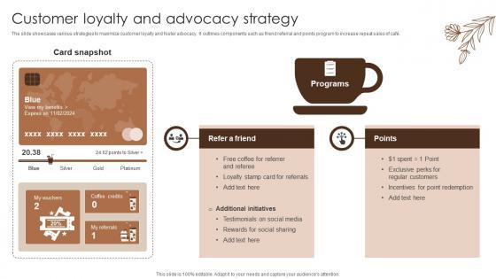 The slide showcases various strategies to maximize customer loyalty and foster advocacy. It outlines components such as friend referral and points program to increase repeat sales of cafe.Boost your pitch with our creative Customer Loyalty And Advocacy Strategy Coffee Bar Go To Market Strategy GTM SS V. Deliver an awe-inspiring pitch that will mesmerize everyone. Using these presentation templates you will surely catch everyones attention. You can browse the ppts collection on our website. We have researchers who are experts at creating the right content for the templates. So you do not have to invest time in any additional work. Just grab the template now and use them. The slide showcases various strategies to maximize customer loyalty and foster advocacy. It outlines components such as friend referral and points program to increase repeat sales of cafe.