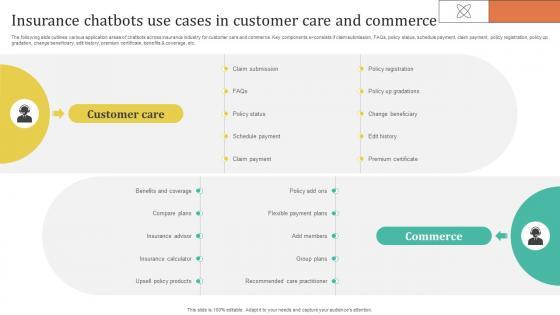 The following slide outlines various application areas of chatbots across insurance industry for customer care and commerce. Key components s consists if claim submission, FAQs, policy status, schedule payment, claim payment, policy registration, policy up gradation, change beneficiary, edit history, premium certificate, benefits and coverage, etc. Presenting this PowerPoint presentation, titled Improving Customer Satisfaction Insurance Chatbots Use Cases In Customer Care, with topics curated by our researchers after extensive research. This editable presentation is available for immediate download and provides attractive features when used. Download now and captivate your audience. Presenting this Improving Customer Satisfaction Insurance Chatbots Use Cases In Customer Care. Our researchers have carefully researched and created these slides with all aspects taken into consideration. This is a completely customizable Improving Customer Satisfaction Insurance Chatbots Use Cases In Customer Care that is available for immediate downloading. Download now and make an impact on your audience. Highlight the attractive features available with our PPTs. The following slide outlines various application areas of chatbots across insurance industry for customer care and commerce. Key components s consists if claim submission, FAQs, policy status, schedule payment, claim payment, policy registration, policy up gradation, change beneficiary, edit history, premium certificate, benefits and coverage, etc.