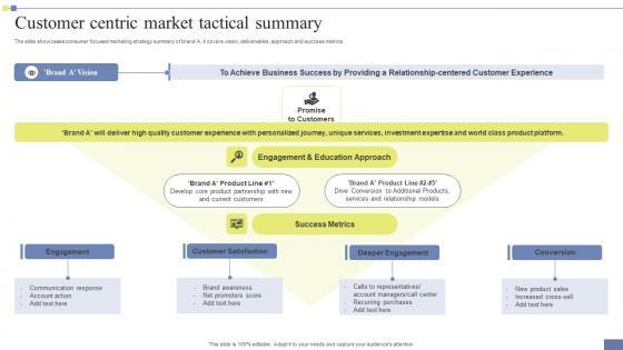 The slide showcases consumer focused marketing strategy summary of brand A. it covers vision, deliverables, approach and success metrics. Pitch your topic with ease and precision using this Customer Centric Market Tactical Summary Slides Pdf. This layout presents information on Engagement, Customer Satisfaction, Deeper Engagement, Conversion. It is also available for immediate download and adjustment. So, changes can be made in the color, design, graphics or any other component to create a unique layout. The slide showcases consumer focused marketing strategy summary of brand A. it covers vision, deliverables, approach and success metrics.