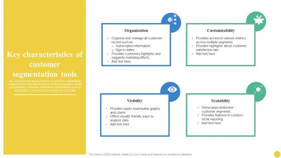 The slide presents various features of customer segmentation software tools to classify and group customers based on similar characteristics. It provides information about features such as organization, customizability, visibility and scalability. This Key Characteristics Of Customer Segmentation Tools User Segmentation Formats Pdf from Slidegeeks makes it easy to present information on your topic with precision. It provides customization options, so you can make changes to the colors, design, graphics, or any other component to create a unique layout. It is also available for immediate download, so you can begin using it right away. Slidegeeks has done good research to ensure that you have everything you need to make your presentation stand out. Make a name out there for a brilliant performance. The slide presents various features of customer segmentation software tools to classify and group customers based on similar characteristics. It provides information about features such as organization, customizability, visibility and scalability.